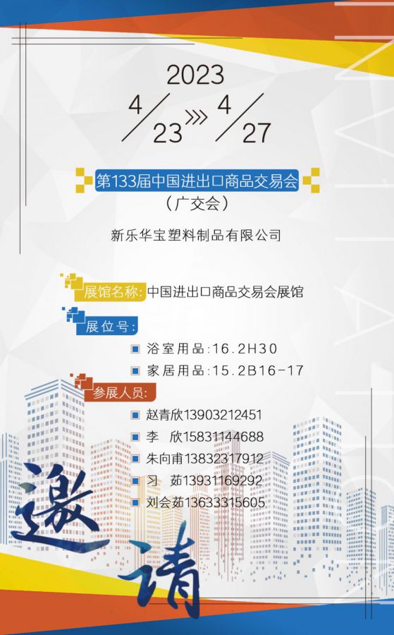 當(dāng)前位置:網(wǎng)站首頁 新聞動態(tài) 展會信息 廣交世界,互利天下,新樂華寶塑料制品二期展位號:浴室用品16.2H30 /家居用品15.2B16-17